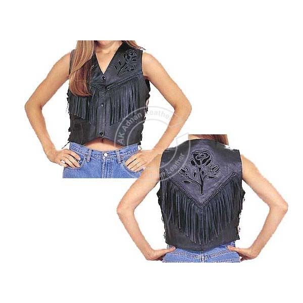 Ladies black leather braided/fringe vest with black rose inlay and side lace.