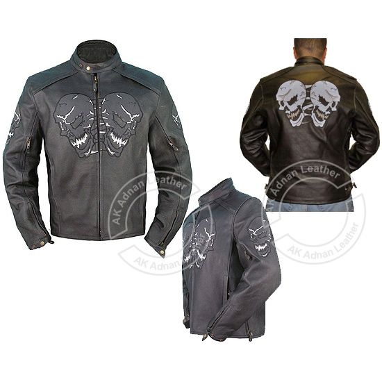 The skull graphic uses highly reflective material in Charcoal color. The graphics are subtle in the day light (charcoal reflective over black leather), but highly reflective at night in head lights.